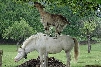| Dire merci | Nouveaux exos à pieds en rentrant ! Comme la semaine dernière, Guarda laissée à l'attache pendant que je préparais l'aire de jeu, ça me permet de lui faire bosser l'attache. Ben là, grâce à Méro, elle l'a bien bossée !! Ils étaient au paddock pendant que je préparais dans le pré (j'ai changé d'endroit volontairement, histoire qu'elle ne s'habitue pas à ce que les choses soient tout-à-fait identiques et donc plus faciles). Sauf que le Méro, va savoir pourquoi, s'est fait peur en se rendant compte qu'il y avait le carré de tissu blanc dans le pré Il est parti en sucette, 3 fois, alors qu'il était tout contre Guarda. Elle a donc bougé aussi mais a bien respecté l'attache à chaque fois, pas de tirage au renard ! J'étais assez loin d'elle, environ 10 m, j'ai sifflé pour la rassurer, est-ce que ça a aidé ou est-ce qu'elle a réussi toute seule, je ne sais pas, mais le bon résultat est là |
