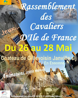 | Dire merci | 3 jours : - le premier (samedi) les cavaliers arrivent, bouf ensemble le soir ! - hébergement : cavaliers sous tentes, chevaux en paddocks (dans de l'herbe jusqu'aux genoux) - le deuxième jour (dimanche), petit-déjeuner entre cavaliers, jeux équestres, sortie balade chaque groupe décide de son parcourt ou accompagne un autre groupe. L'an dernier le but était l'inauguration de la boucle équestre balisée par le Parc du Gâtinais. Étant donné que dans mon groupe (Eden Hobby Sarkane) il y avait un petit poney (Hobby), et un jeune cheval à peine débourré (Sarkane), nous n’avons effectué qu'une partie de la boucle, principalement pour économiser le pauvre poney qui habituellement se la coule douce au pré L'après midi du dimanche parcours PTV dans le parc du château, PTV simple accessible à tous. Repas pique-nique le midi (possibilité de manger également au restau du château) NB : Sur place il y a un coin sanitaire/douches sympas, mais pas de possibilité d'hébergement autre que sous tente. - le troisième jour, férié pour certains qui ont encore leur lundi de Pentecôte, déjeuné et retour en rando vers leurs écuries respective. Moi je n’ai participé qu’à la journée du dimanche, donc pas de camping, nous sommes venus en camion avec les 3 chevaux le matin au lieu de randonner depuis chez nous. Nous avons attaché nos chevaux car nous n’avons eu le courage de monter des paddocks. Tu peu participer 1 2 ou les 3 jours, je pense que celui qui est le plus intéressant c’est le dimanche, en plus il y a au loin le meeting aérien de la Ferté-Alais, trop loin pour faire peur aux chevaux mais suffisamment pré pour arriver à voir la patrouille de France |