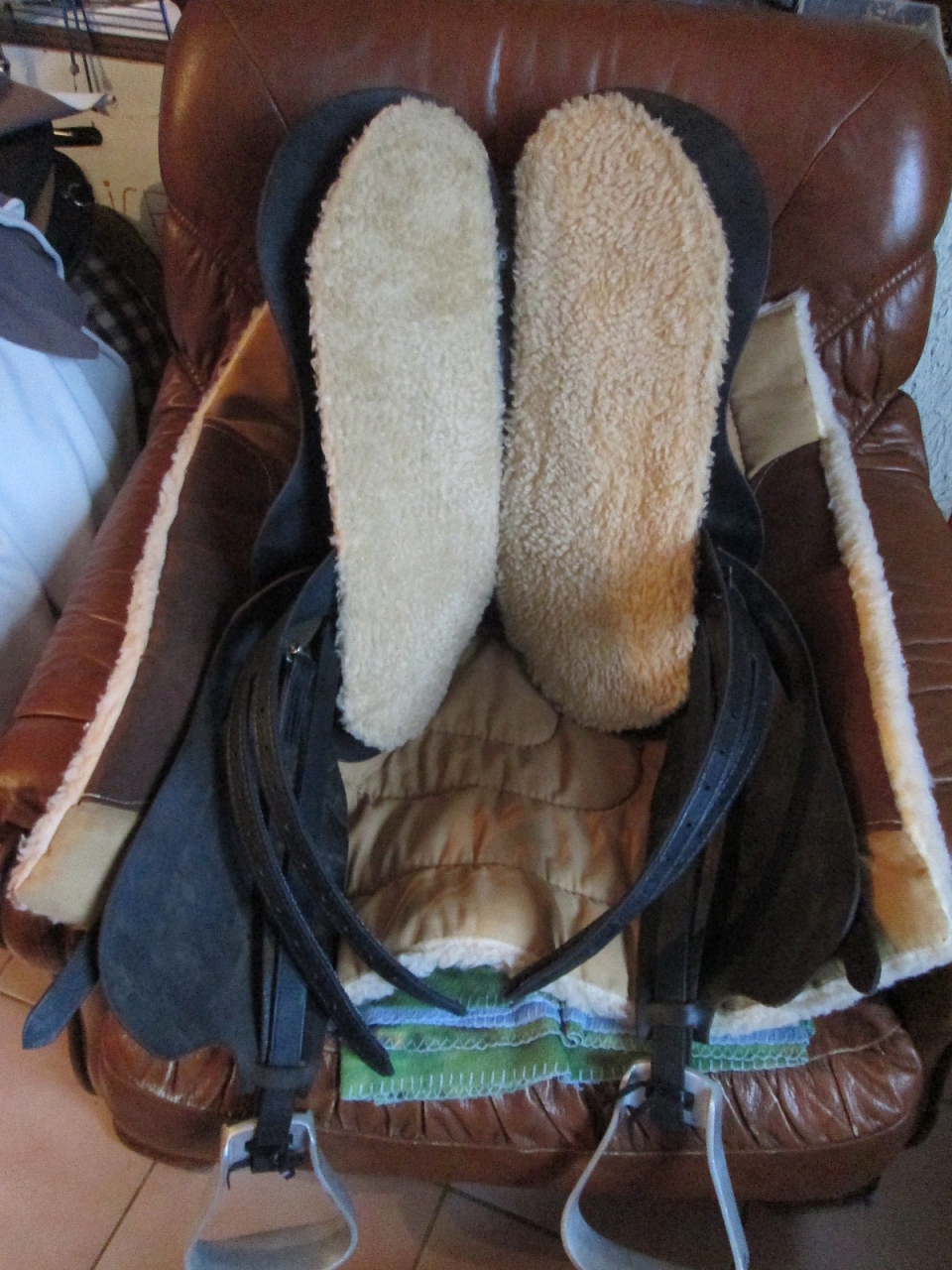 | Dire merci | Des étriers plancher large fermé (style Etrical) couleur marron Des étrivières confort Gaston Mercier (ou équivalent) marron Sangle wintec marron (en 125 je pense mais à vérifier) Moumoute de selle en vrai mouton marron (17p) Message édité le 07/07/15 à 09:54 |