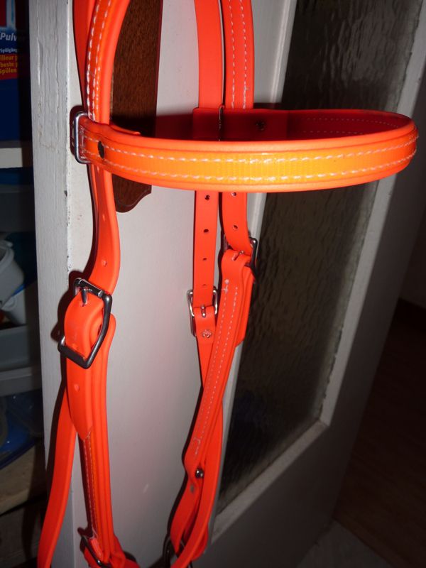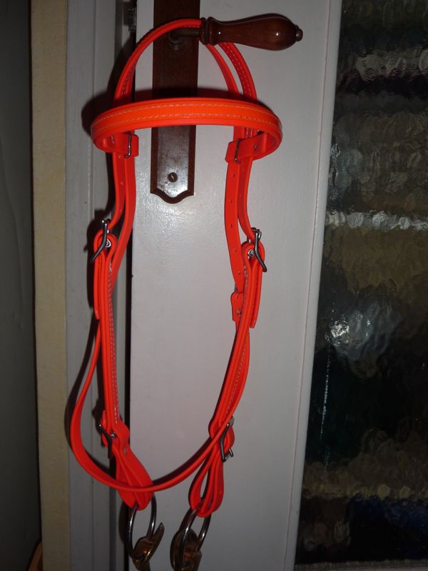 Dire merci | J'ai un bridon en beta biothane orange fluo doublé orange fluo sur le frontal et la têtière (taille cheval mais réglable, je peux le mesurer). |