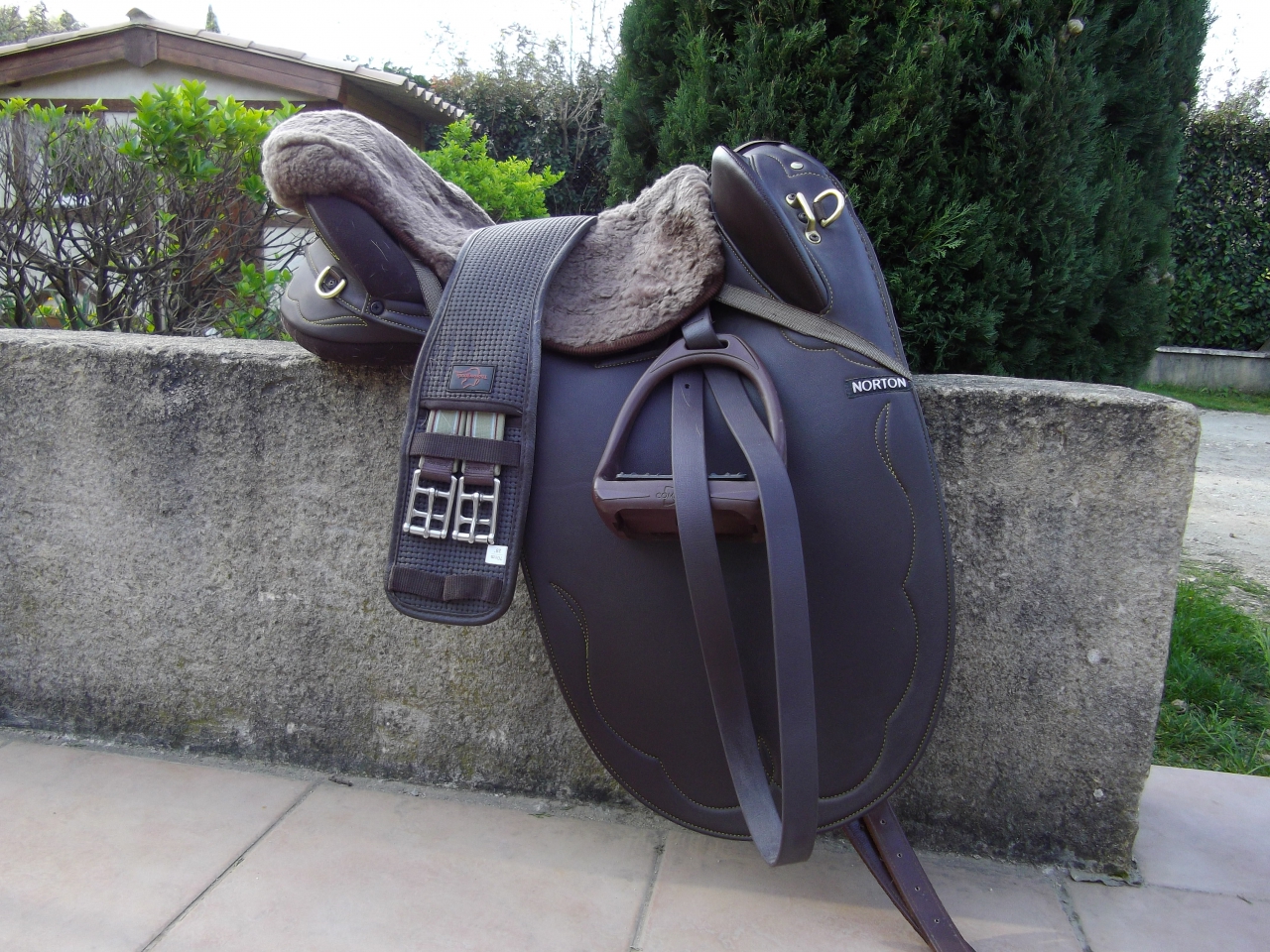 | Dire merci | j'ai une norton stock l'arcade correspond à la verte chez wintec taille 17.5, marron toute equipée. Tres confortable mais un peu etroite pour mon cheval |