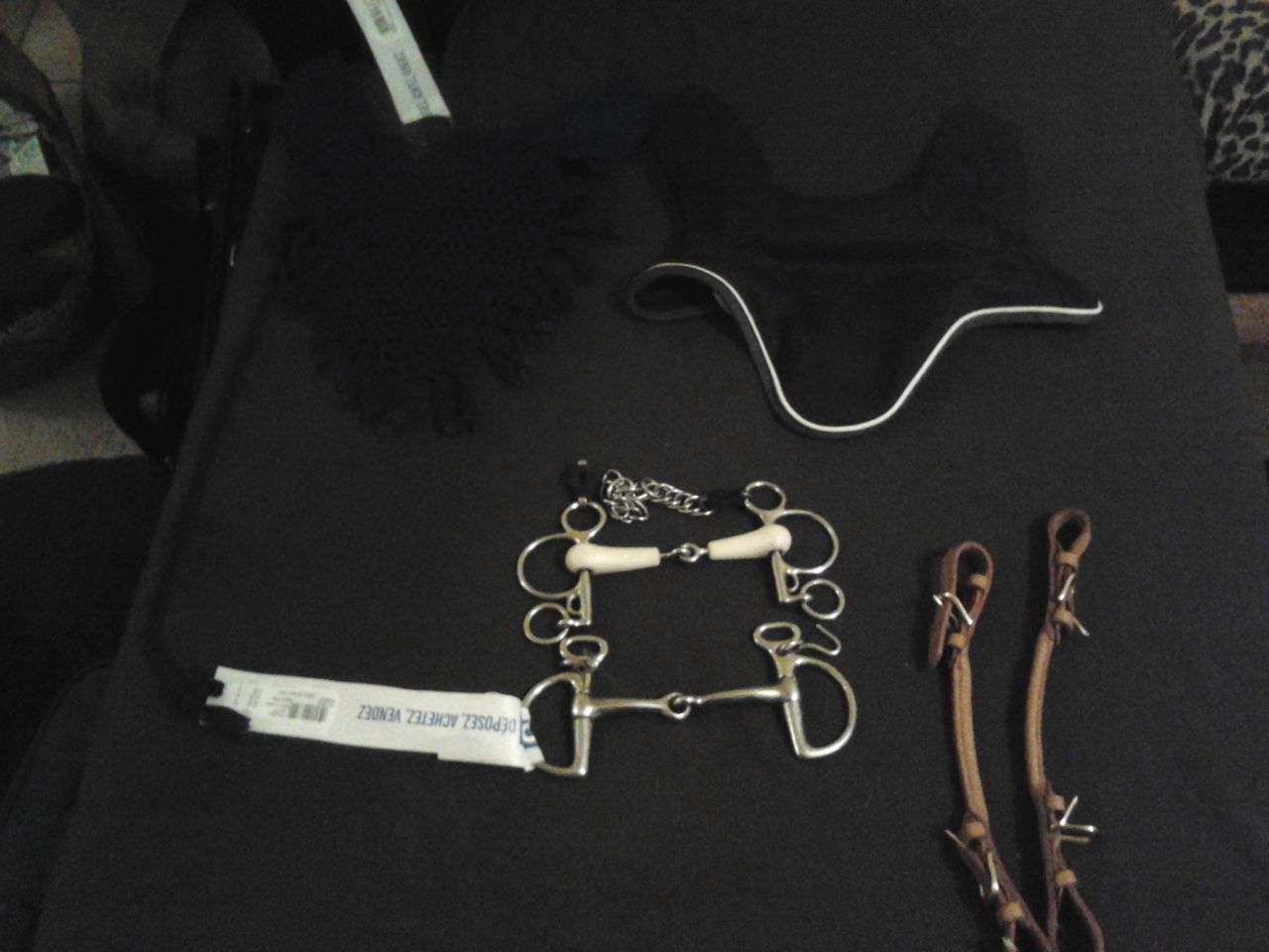 | Dire merci | et j ajoute...![]() bonnets (1 bleu roy+1noir) 1 goyo 115mm+le Pelham resine 115mm ![]() amortisseur moumoute et un dessus de selle synthetique style mouton ![]() guetres taille cob marron ![]() sangle western ![]() tapis vert pomme une bombe choplin T55 qui a bien vecu! |