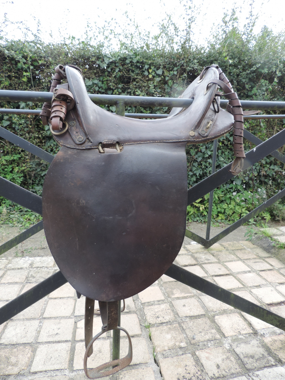 | Dire merci | Selle USA avec quartiers. En cuir gras hyper souple, marron foncé limite noir. Nombreuses sangles pour fixer les bagages, a l avant et a l'arrière. Sanglage classique avec contre sanglons en bon état (il manque celui du milieu d'un côté). L attache avant du quartier gauche a été réparée. Le sigle USA est gravé sur les contre sanglons, sur la selle, et sur les attaches de bagages. Dessous de la selle recouvert de toile. Entièrement d'origine. ![]() Message édité le 26/09/14 à 18:39 |