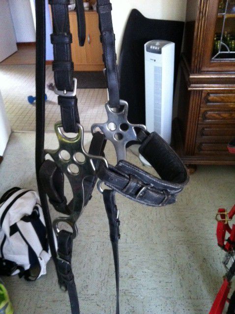 Déconnecté | Les renes allemandes c'est celle la: Lien Il y a 2 parties en cuir en plus pour pouvoir les attacher sur les côtés de la sangle. Marron foncé toute neuve |