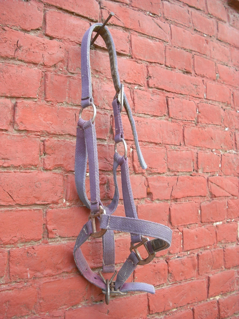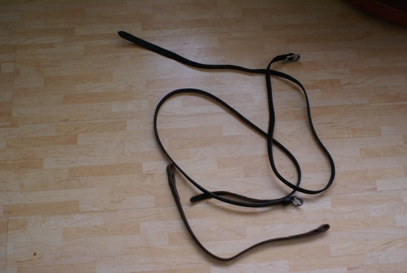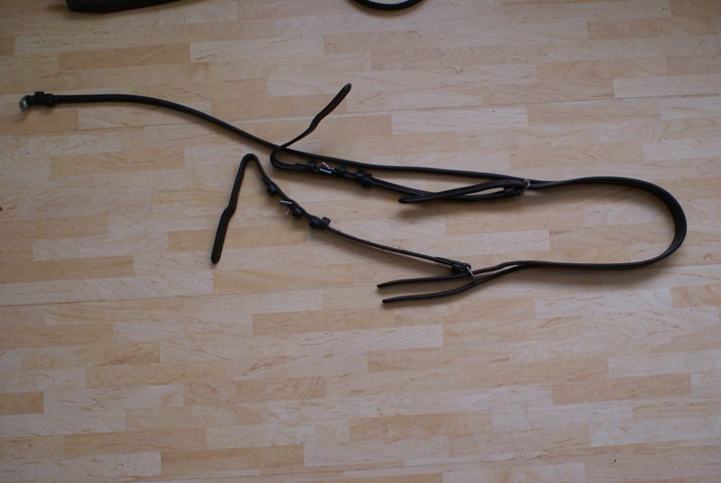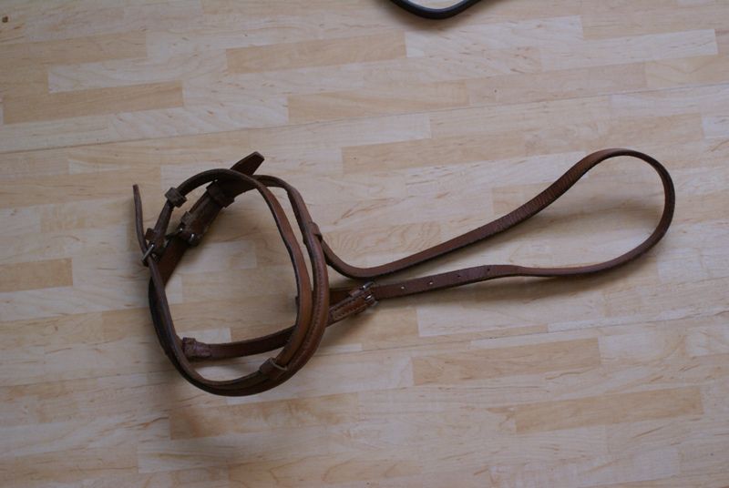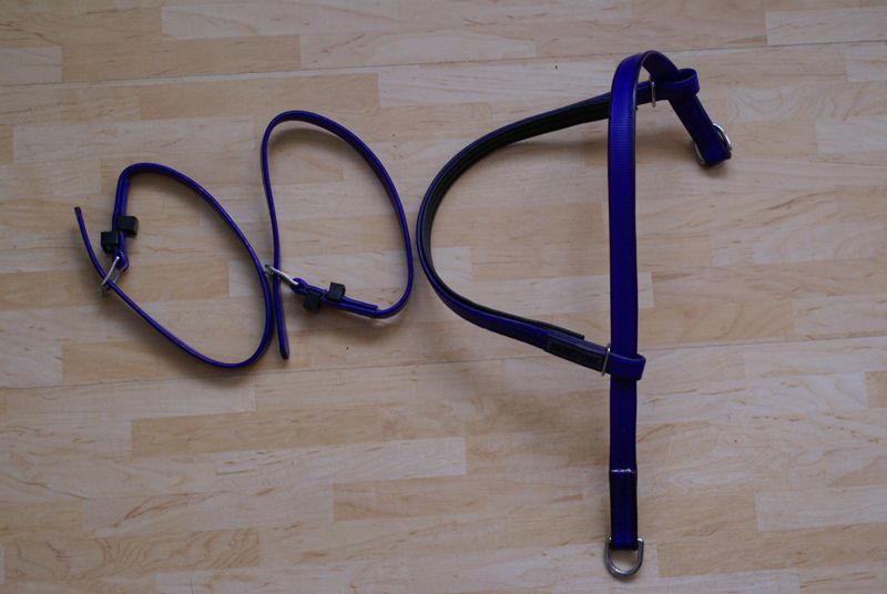 | Dire merci | Le premier est violet (délavé) avec tétière et partie de la muserolle doublés en cuire![]() Le second est multicolore, non doublé ![]() Le troisième est bleu marine, tétière et muserolle doublés en tissu ![]() Tous les trois ne sont pas neufs mais encore bien utilisables, sachant que le premier est le plus costaud. |
