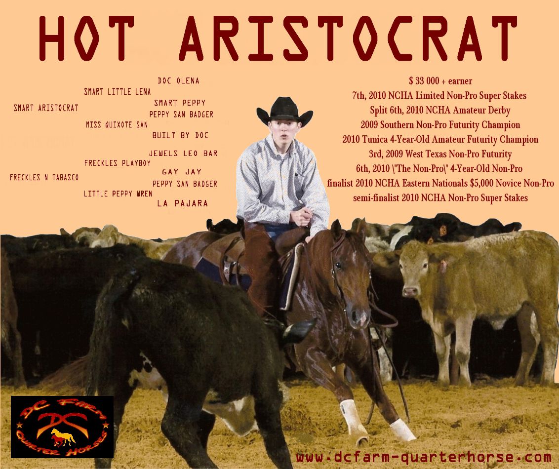 | Dire merci | Voici la dernière arrivée, en compétition pour encore au moins 2 ans, puis repro, car on a craqué sur les origines: Hot Aristocrat, qui est arrivée du texas en mai dernier:![]() |