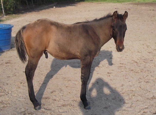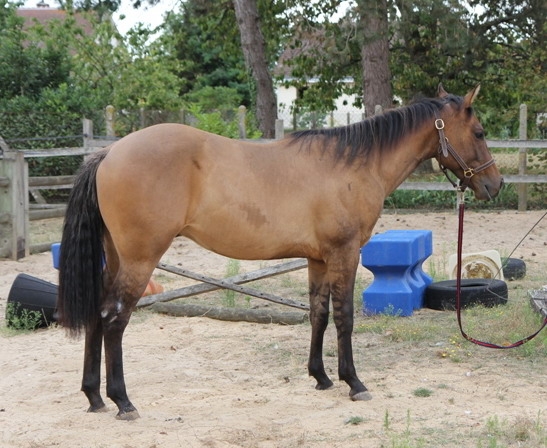 | Dire merci | Tu aimes ? je le trouve un peu ensellé ;-( son père : Dun Bar Stripes (par Mucho Bueno Lynx et Lil Smoky Suzanne) sa mère : Lady Skip Lu (par Tufy Leo Plaudit et Sister Skip Lu) je n'y connais rien en quarters, d'après l'éleveur, il a de bonnes origines |