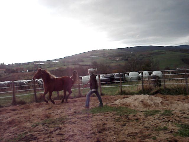 | on a essayé de trotter mais monsieur avait un peu trop la patate (accelere et plus de direction) donc on est restés au pas. bon , ici pour moi je vois une autre erreure , si le cheval accélere, la pire chose sur un jeune cheval serait bien d'aller mettre de la jambe. LEs jambes restent muette tant et aussi longtemps que le cheval n'est pas calme et décontracté. |