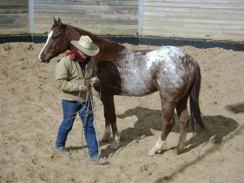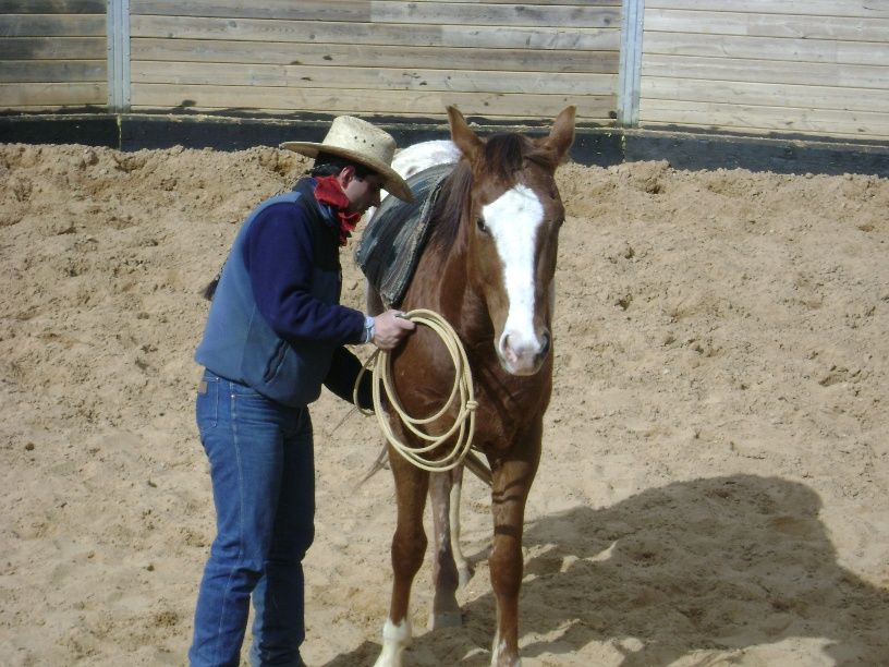 | Dire merci | Et donc, après le "JU" il a effectué la désensibilisation du poulain en le touchant partout, en lui soulevant les postérieurs avec le lasso, en lui envoyant en cadence le lasso autour des antérieurs puis des postérieurs, en le faisant siffler au dessus de ses oreilles...Puis il a passé le tapis de selle partout sur son corps et lui a même posé sur la tête. Le poulain est resté imperturbable (faut dire quand même que c'est un "deux de tension", pas du genre "pète en l'air" qu'on a là). |