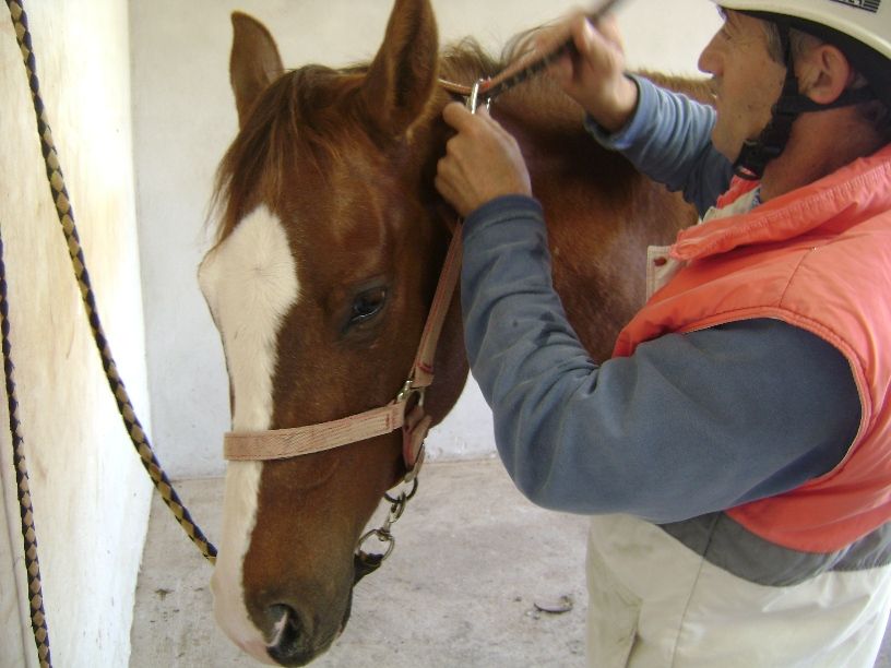 | Dire merci | Et bien c'est ce que je vois, le cavalier qui passe la longe au dessus de la tête. |