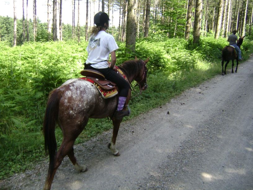 | Dire merci | C'est un poulain particulièrement proche de l'homme, tout spécialement de son maître (faut que je mette une photo où c'est lui qui le monte puisqu'en fait c'est le cheval attitré de mr), câlin, attentif, confortable, calme et spécialement confiant. Mais moi je ne monte pas dessus, je ne me sens pas encore assez confiante et je préfère "ma grosse" car je la connais (avec ses travers). |
