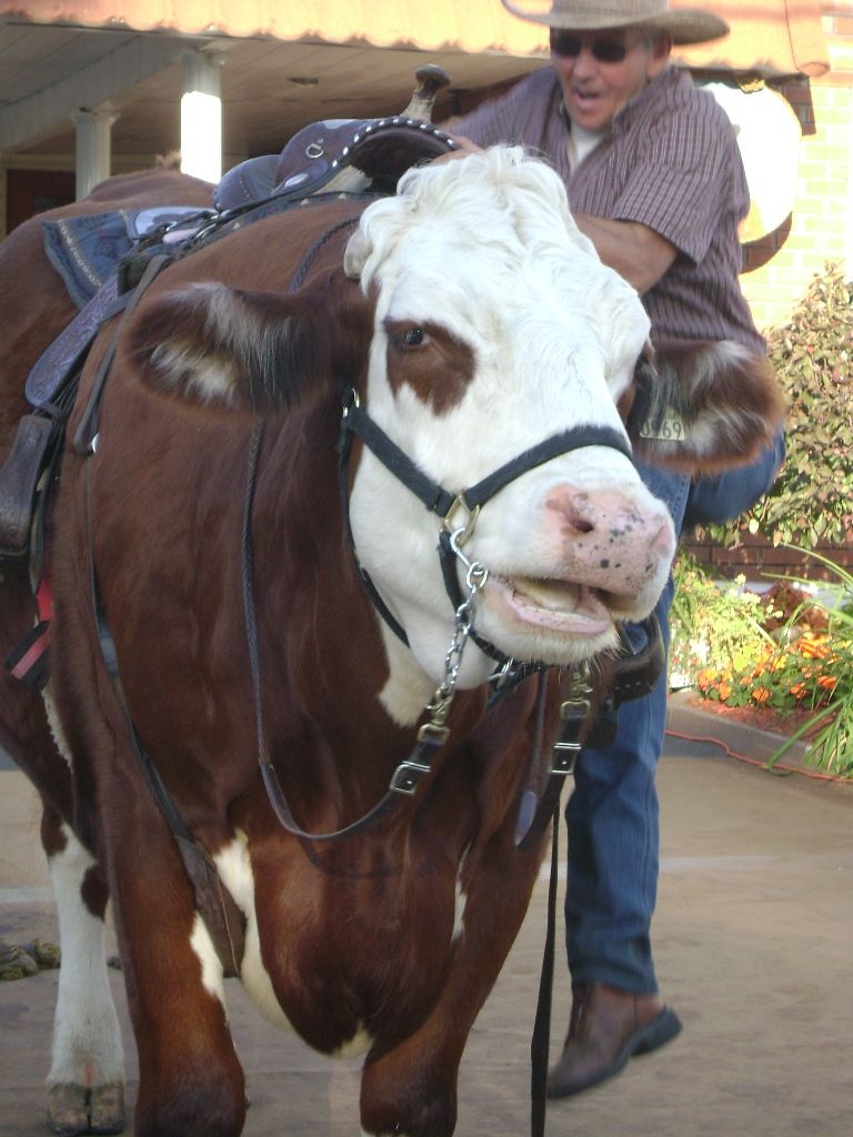 | Dire merci | Ce n'est pas une vache mais un boeuf...Il est réellement très grand et aussi très très gentil...Il a été élevé au biberon (évidemment) car sa mère est morte à la naissance. J'ai eu la chance de parler un peu avec le monsieur qui le montait, il nous a même montré ses "fers" qui sont en bois et qui s'usent très vite. Ce bovin a également un mors (c'est une chaînette en métal). Enfin, il adooore son cow-boy, si vous aviez vu comme il ne le perd jamais des yeux quand il n'est pas monté... Le monsieur m'a proposé de monter dessus et de me prendre en photo mais j'ai refusé... ![]() |