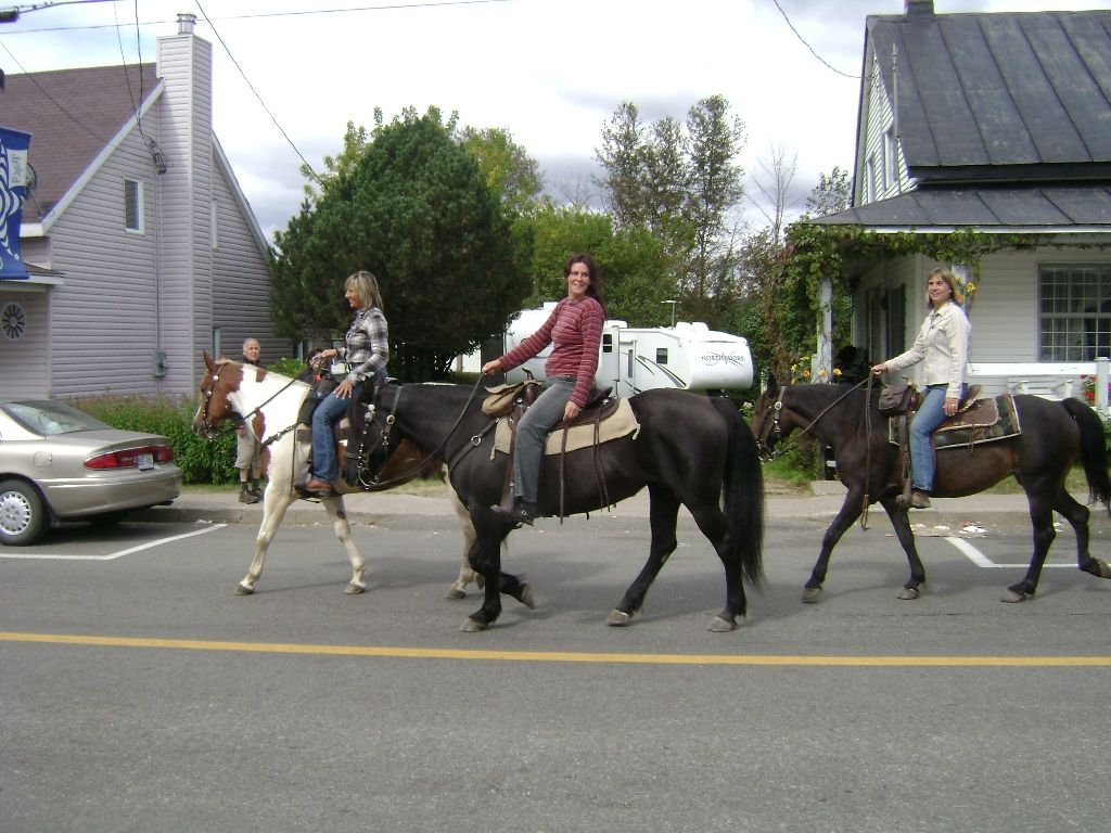 | Dire merci | Nous étions un groupe de français bien sympathiques...(je dis cela car en fait nous avons rencontré les autres frenchies sur place, et nous n'avons pas été déçus...on a bien rigolé...et on a gagné des amis !) et à St Tite, nous avons d'abord fait du shopping. Nous, il fallait nous rhabiller vu que nos bagages étaient restés coincés je ne sais où à l'aéroport... Puis nous avons flâné dans les rues, histoire de voir le folklore local. Ensuite, en bon français, nous avons goûté aux plats locaux (ça tient au corps, notamment le "poutine smoked meat" , et nous avons pu assister à des spectacles et le soir au fameux RODEO qui inclut plusieurs disciplines très techniques et variées.le "poutine smoket meat" : ![]() Au passage, j'espère que weby remarquera que nous avons porté les couleurs d'1cheval.com bien en évidence de l'autre côté de l'Atlantique !!! |