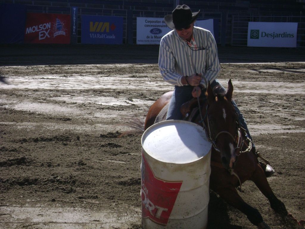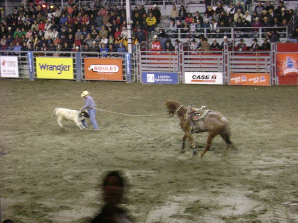 | Dire merci | D'ailleurs, on a vu un truc marrant dans une autre épreuve où il ne s'agissait pas de ligoter le veau mais de sauter du cheval et de retourner le veau les cornes sur le sol...le cow boy a loupé le veau avec la corde et le cheval reculait, reculait à toute vitesse pour essayer de tendre une corde qui n'avait rien attrappé... |