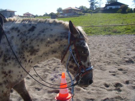 | Dire merci | Siouxx : je montais rênes plutôt longues, puis je me suis rendue compte qu'il était trop "perdu", manque de rectitude... donc j'ajuste mes rênes de façon à avoir le contact, ça se passe beaucoup mieux ! J'aime bien son attitude sur la photo et la longueur des rènes. Ton side est correct aussi pour bosser. Bon pour le trot, tu prends un contact moyen (comme tu fais par rapport à la rectitude) et c'est les jambes qui doivent bosser plus, par pression ou par bump s'il ne réagit pas. Dès qu'il esquisse une descente vers le bas, donner du mou et féliciter beaucoup à l'arret. Reprendre au trot et ainsi de suite, sachant qu'au début c'est plus facile sur un cercle et très difficile sur les changements de direction ! ![]() |