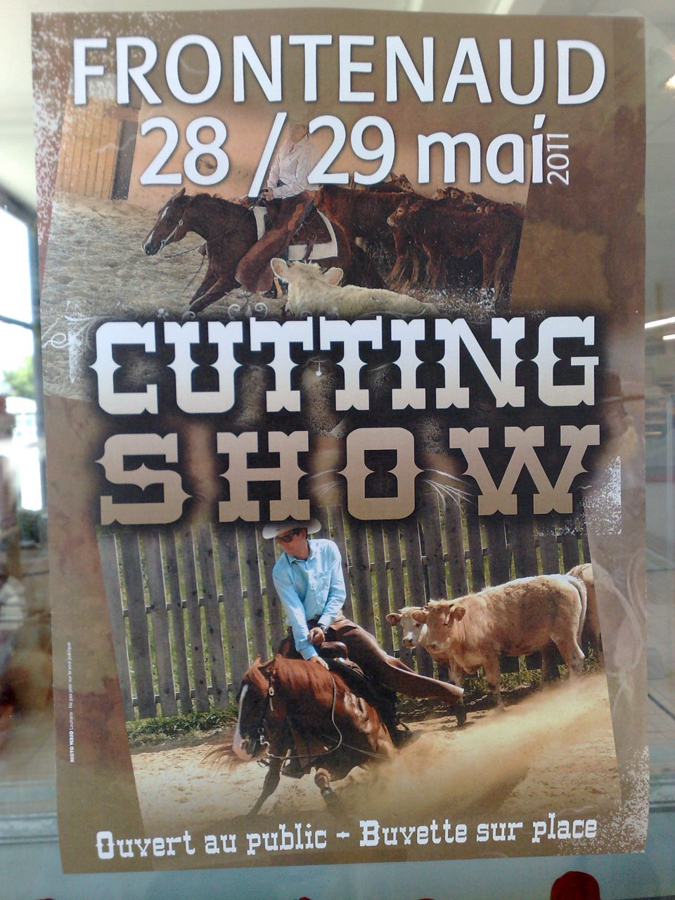 | Dire merci | Comme il y a rien de marquer, pas de précision sur le sujet, juste "Cutting Show" donc pas facile de savoir s'il s'agit d'un concours ou autre!!! Il y même pas de numéro de téléphone ou autre contact sur l'affiche!?! Mais dès que je vois une manifestation équestre je le signale. ![]() |