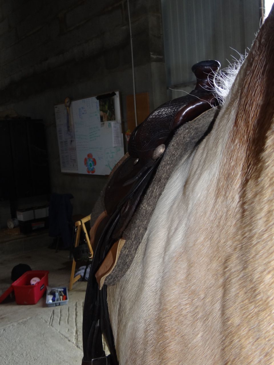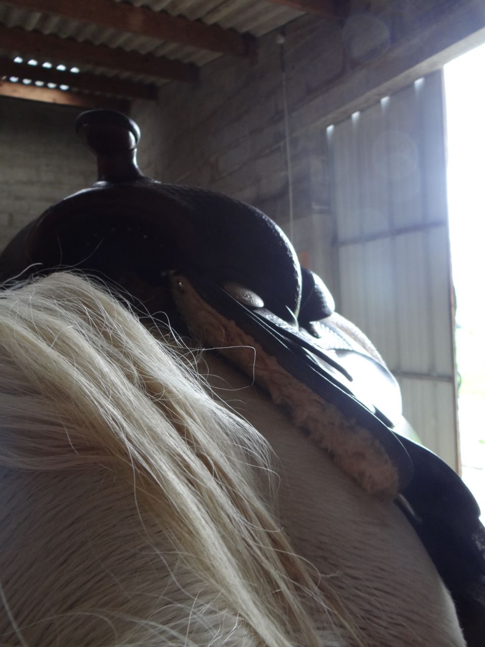 | Dire merci | Par contre quand je passe ma main en-dessous j'ai l'impression qu'il y a plus de pression au niveau des épaules que sur le reste du dos si on se réfère à la première photo, c'est peut être parce que tu a mis la selle trop en arrière. Il faut l'avancer, sangler et contrôler de nouveau |