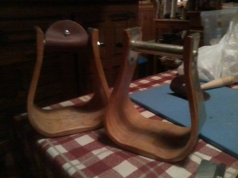 | Dire merci | J'ai donc remis des étriers larges bois/alu dessus, mais ils étaient vendus sans la pièce de cuir que le fender entoure. Comme je fais un peu de bourrellerie je l'ai posée ce soir. J'hésite à mettre une "semelle" de cuir... ![]() |