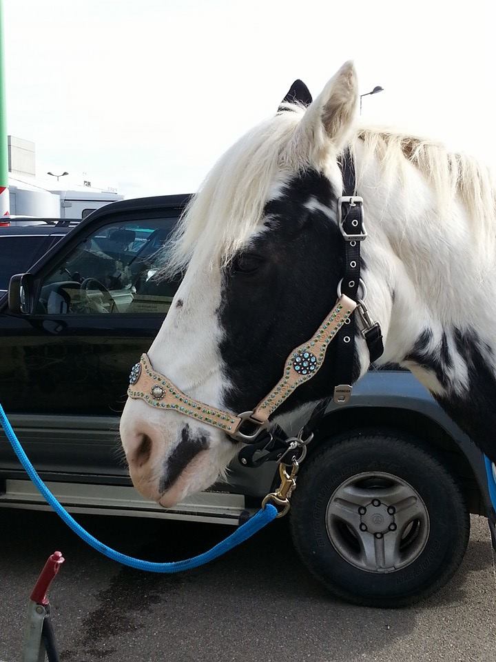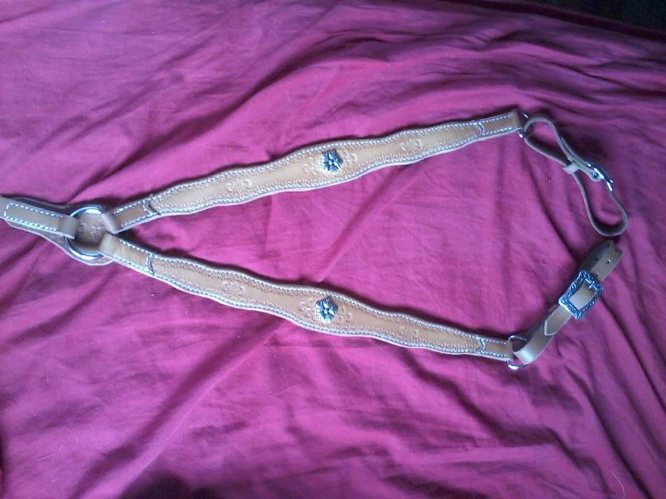 | Dire merci | Oui c'est super gratifiant, je crois que ce qui m'a fait le plus plaisir c'est la confection du collier de chasse et du bridon de Sisi (bon en l'occurence tout était assorti à l'ancienne selle qui était couleur naturelle, et l'actuelle est entre noisette et acajou...et je ne monte plus en bridon mais en licol lol, du coup bridon en déco...)![]() ![]() Et aussi ce licol de show mi-nylon mi-cuir avec cristaux de swarovski turquoises et verts pour un superbe criollo pie noir de barrel...mon licol a été mis et exposé à EquitaLyon 2013, j'étais super contente, une sacrée pièce... ![]() ![]() Dommage un peu grand, la proprio m'avait donné une taille un poil grande il aurait fallu cob au lieu de cheval |