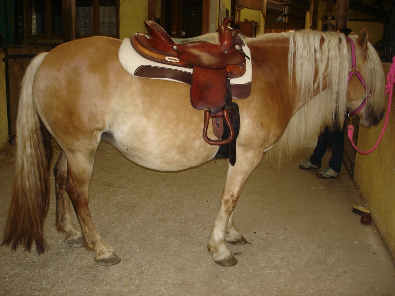| Dire merci | Voilà je vais devoir changer la selle de Sisi, petite haflinger de 8 ans. Alors on a un souci: la ponette n'est pas énorme mais a un dos plat, droit, quasi pas de garrot (et garrot très court en plus) et des épaules carrées. Et de l'autre côté moi je fais 1m58 avec 70cm de jambes donc je dois choisir un modèle avec enfourchure assez étroite. Actuellement j'ai 2 Continental, dont celle qui ne va pas et la 2° va à ma vieille jument mais pas à la jeune. Quelles autres marques ont une enfourchure étroite? Je ne suis pas bloquée sur Conti, mais je ne veux plus d'arçon Equiflex. La jument ne pourra pas porter de selle qui dépasse 65cm de long, et moi je fais du ranch sorting et balade avec la petiote. je prends soit du 15,5 soit du 16 en taille de siège habituellement. Merci d'avance!!! |