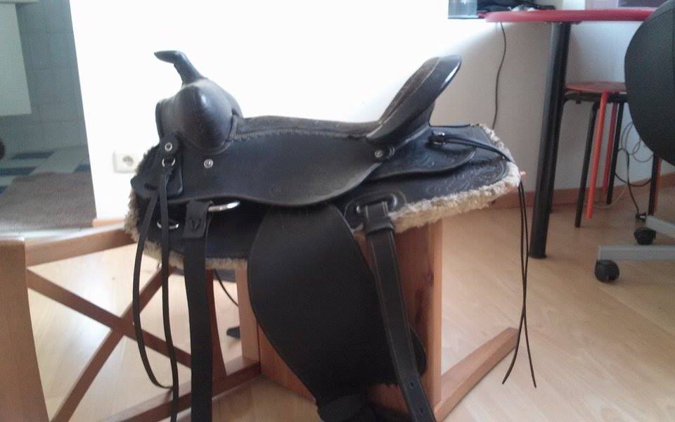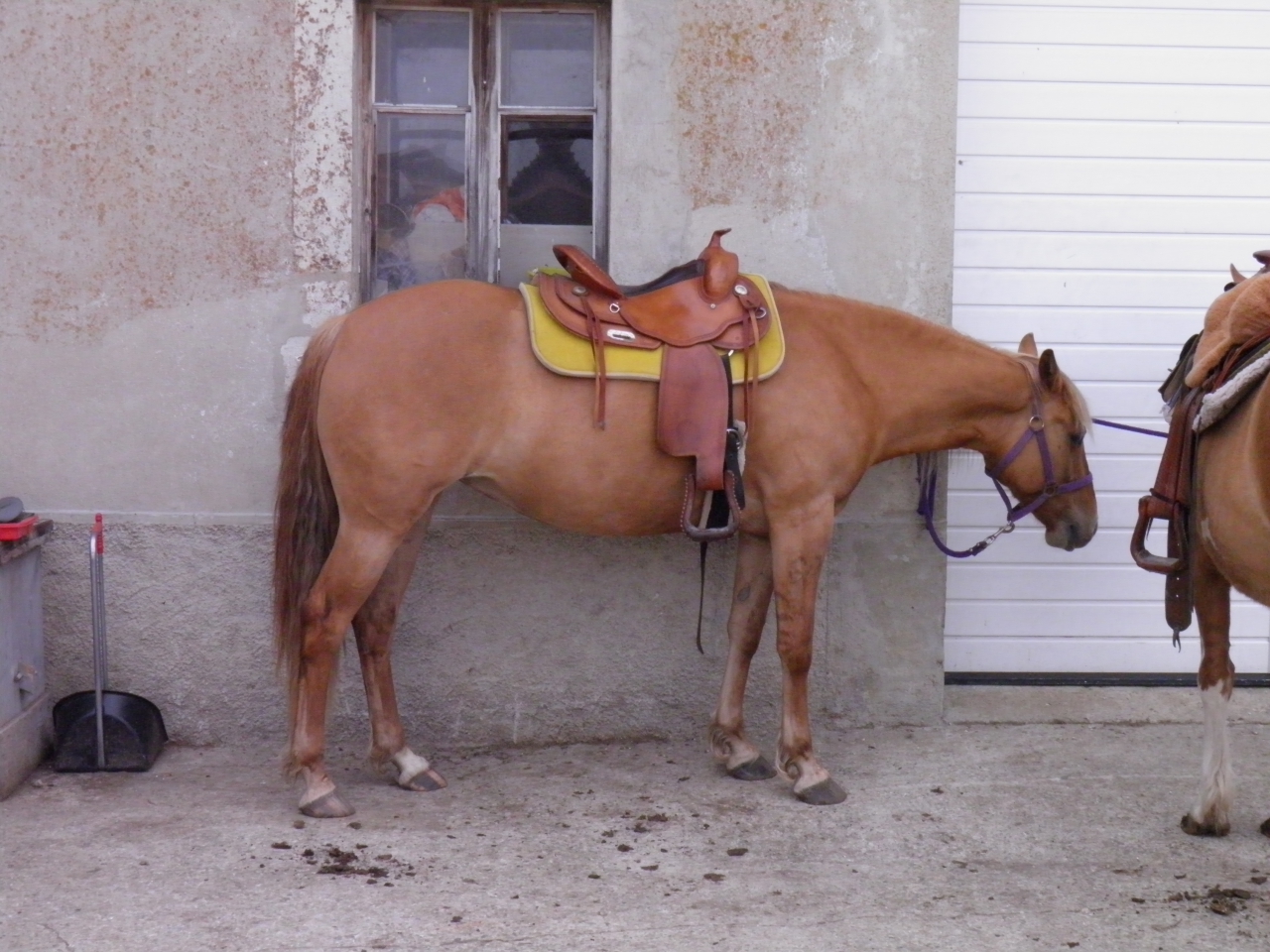 | Dire merci | Bien, j'ai récupéré la selle pour un test, côté garrot, c'est bon, la taille va, en revanche, je reste encore dubitative pour sa longueur. Comme je suis chanceuse, un représentant d'Equiselle57 (Consultant en selle d’équitation) était à mon écurie et a pu donner son avis Ainsi, il estime que pour de la balade, elle peut convenir mais il faudra juste que je vérifie que la selle n'irrite pas la juju au niveau des hanches après de longs trajets.Donc en gros, ce n'est pas la selle idéale, si l'envie me prend le faire du barrel racing, va falloir que je parte à la quête d'une selle plus adaptée mais j'en suis pas là, je désire juste profiter du soleil et des balades ! Sinon, forcément, j'ai posé mon popotin dessus ... quel plaisir, c'est top confortable , j'adore ! Voilou la bête sur la belle |