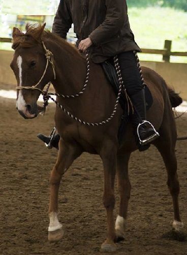 | Dire merci | Le hackamore Bosal c'est tres compliqué si on veut l'utiliser correctement (je trouve) et le cheval doit connaitre parfaitement la rene d'appui. Quand au hackamore mécanique, beurk, je les ai tous mis au clou.... Au pire si le cheval n'est pas très fiable aux stop, un "vrai" side-pull avec une longe chaîne passée sous le menton, suffira à le remettre aux ordres en cas de sossotterie avérée ![]() |